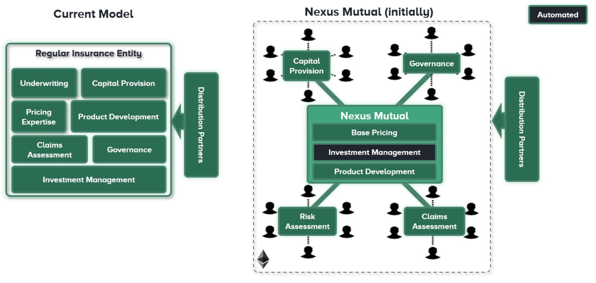 Nexus Mutual4 is a blockchain-based “mutual” that offers decentralized insurance products for digital asset holders. Pricing, claims, investments are decentralised whereas products and governance is partially centralised.